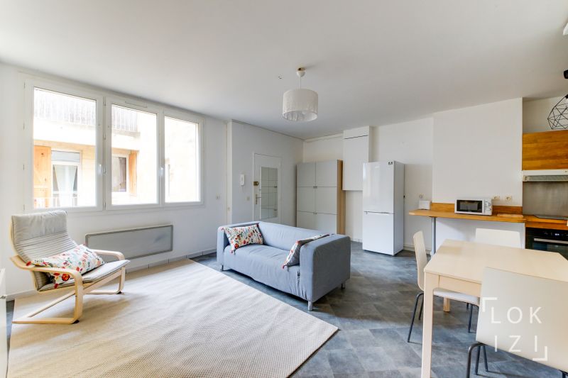 Proche Tram B Victoire, quartier St Michel - Capucins. Appartement T2 fraîchement rénové de 45m², entièrement meublé, équipé, situé au 1er étage (d'un immeuble de 2 étages) et comprenant : - séjour avec cuisine ouverte entièrement équipée (avec canapé, TV, mobilier de rangement, plaques de cuisson, réfrigérateur-congélateur, four, micro-onde, et lave-linge séchant) - chambre avec lit-coffre double couchage (140cm) et armoire - salle de bains (baignoire + wc)
