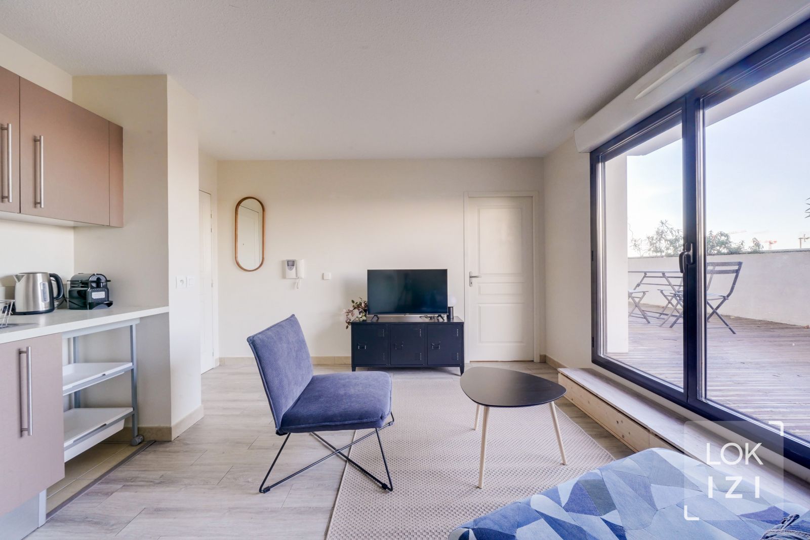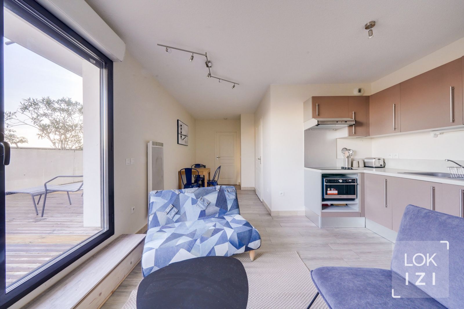 Entre Chartrons et Grand Parc, avec le Tram C à quelques pas, appartement 3 pièces de 55m² (avec vue et sans vis-à-vis) entièrement meublé et équipé, avec terrasse et parking, situé au 3ème étage d'un immeuble de 9 étages (avec ascenseur), et comprenant : - séjour ouvert sur terrasse avec coin salon (avec TV), coin repas, et cuisine ouverte (équipée de plaques de cuisson induction, réfrigérateur-congélateur, four micro-onde combiné, petit électroménager) - 2 chambres avec placard-penderie et accès terrasse (dont 1 suite parentale avec salle d'eau et 1 chambre avec 2 lits simple couchage) - salle de bains (baignoire + lave-linge) - WC séparé - dédagement avec placard-penderie - terrasse de 40m² avec mobilier extérieur - parking (1 place) au sous-sol de la résidence.