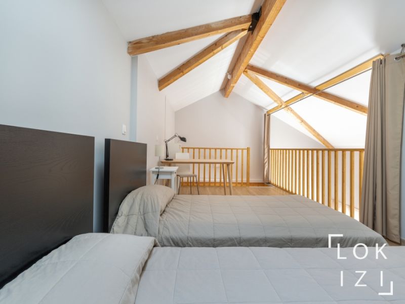 ublé T3bis de 79m² avec balcon et parking, situé au 1er étage d'une résidence récente, et comprenant : - entrée avec placard-penderie - séjour avec cuisine ouverte entièrement équipée (réfrigérateur-congélateur, plaques de cuisson à induction, four, lave-vaisselle, lave-linge, four micro-onde, table de repas extensible 8 couverts, canapé et TV) et accès balcon - balcon-loggia avec mobilier extérieur (table, chaises, transats) - 1 chambre lit double couchage avec placard-penderie - 1 chambre 2 lits simple couchage avec placard-penderie - salle d'eau avec douche et double-vasque - WC - mezzanine mansardée avec 2 lits simples, rideau occultant, mobilier de rangement et coin-bureau (idéal pour télé-travail) - parking aérien (1 place) dans la cour de la résidence - local à vélo sécurisé