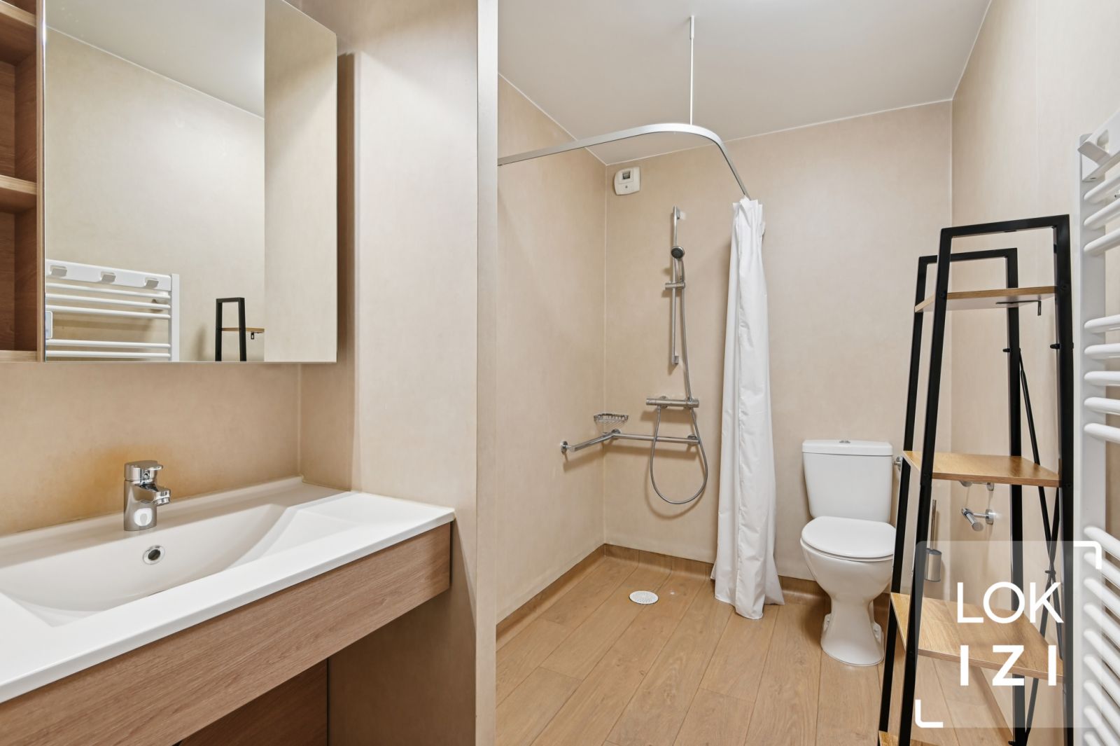 L’appartement (fraîchement rénové) est entièrement meublé et équipé. Il se compose de : - entrée avec double placard-penderie - séjour ouvert sur balcon avec espace salon (avec canapé convertible et TV) et espace repas - cuisine ouverte avec kitchenette (équipée de réfrigérateur-congélateur, micro-ondes, plaques de cuisson, kit vaisselle, petit électroménager, lave-linge) - chambre (double couchage) donnnat sur balcon avec mobilier de rangement - salle d'eau avec douche PMR et WC (attenante à la chambre) - balcon de 4,5m².