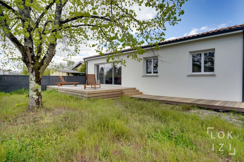 Aux portes de Bordeaux et du Médoc, avec accès rapide à la route des plages océanes (Lacanau, le Porge), lumineuse maison climatisée de plain-pied de 98m² (3 chambres), entièrement équipée (mobilier neuf), avec terrasse, cour, jardin, garage, et comprenant : - entrée avec placard de rangement et WC séparé - séjour-cuisine (donnant sur la terrasse) entièrement meublé et équipé (avec plaques de cuisson vitro-céramiques, réfrigérateur-congélateur, four, lave-vaisselle, coin-bar, canapé, TV, table de repas 6-8 couverts, et bureau) cellier (avec étagères de rangement, lave-linge et sèche-linge) - 3 chambres double couchage avec placard de rangement (dont 1 avec lit 160) - salle d'eau (douche + WC+ lababo double vasque) - garage de 15m² avec étagères de rangement - terrasse en bois (avec mobilier extérieur : table, 6 chaises et transats) - jardin de 500m² contournant la maison