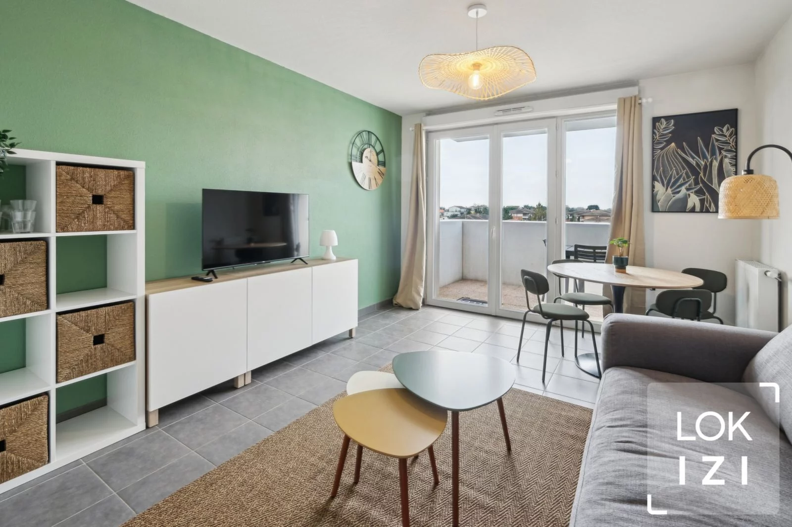 Toulouse - Lalande, proche Blagnac, au sein d'un secteur résidentiel avec toutes commodités. Lumineux appartement meublé T2 de 42m² avec balcon et parking, situé au 3ème et dernier étage d'une résidence récente sécurisée, et comprenant : - entrée avec placard-penderie - séjour donnant sur balcon avec espace salon (canapé / TV), espace repas et kitchenette équipée (plaques de cuisson vitro-céramique, réfrigérateur, kit vaisselle, petit électroménager, micro-onde-grill, lave-linge, rangements) - chambre avec lit double couchage, bureau et placard-penderie - salle d'eau (douche) avec WC - balcon abrité avec mobilier extérieur etvue dégagée - parking au rez-de-chaussée de la résidence.