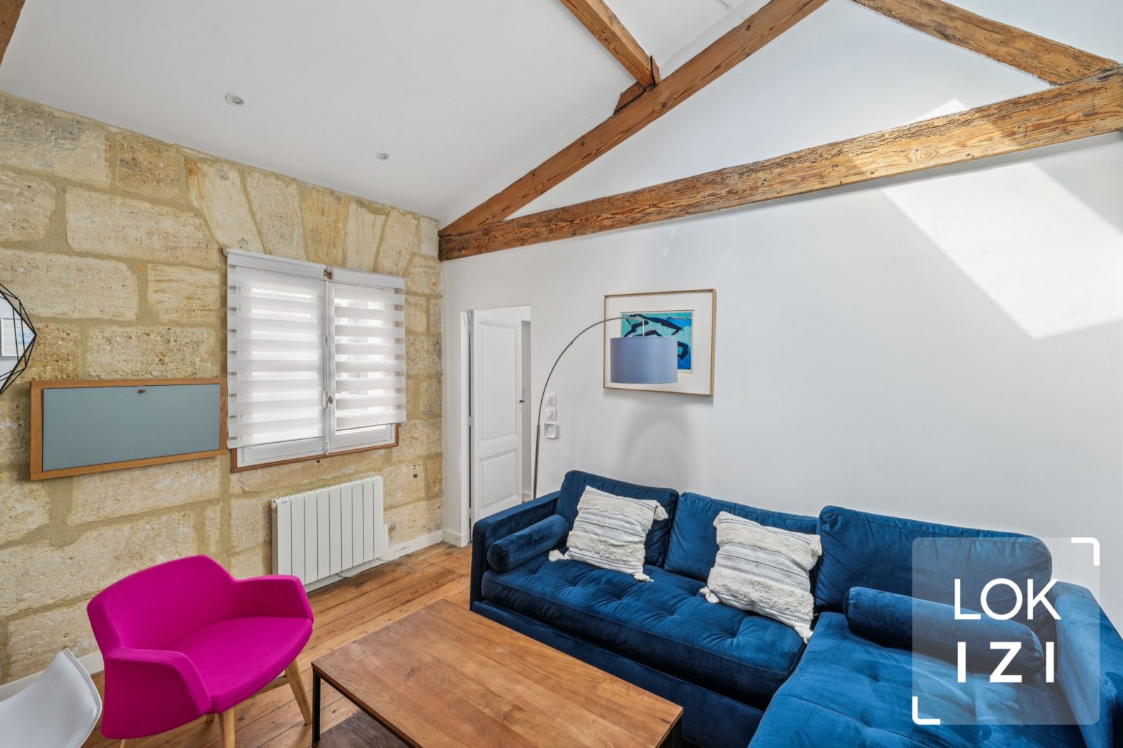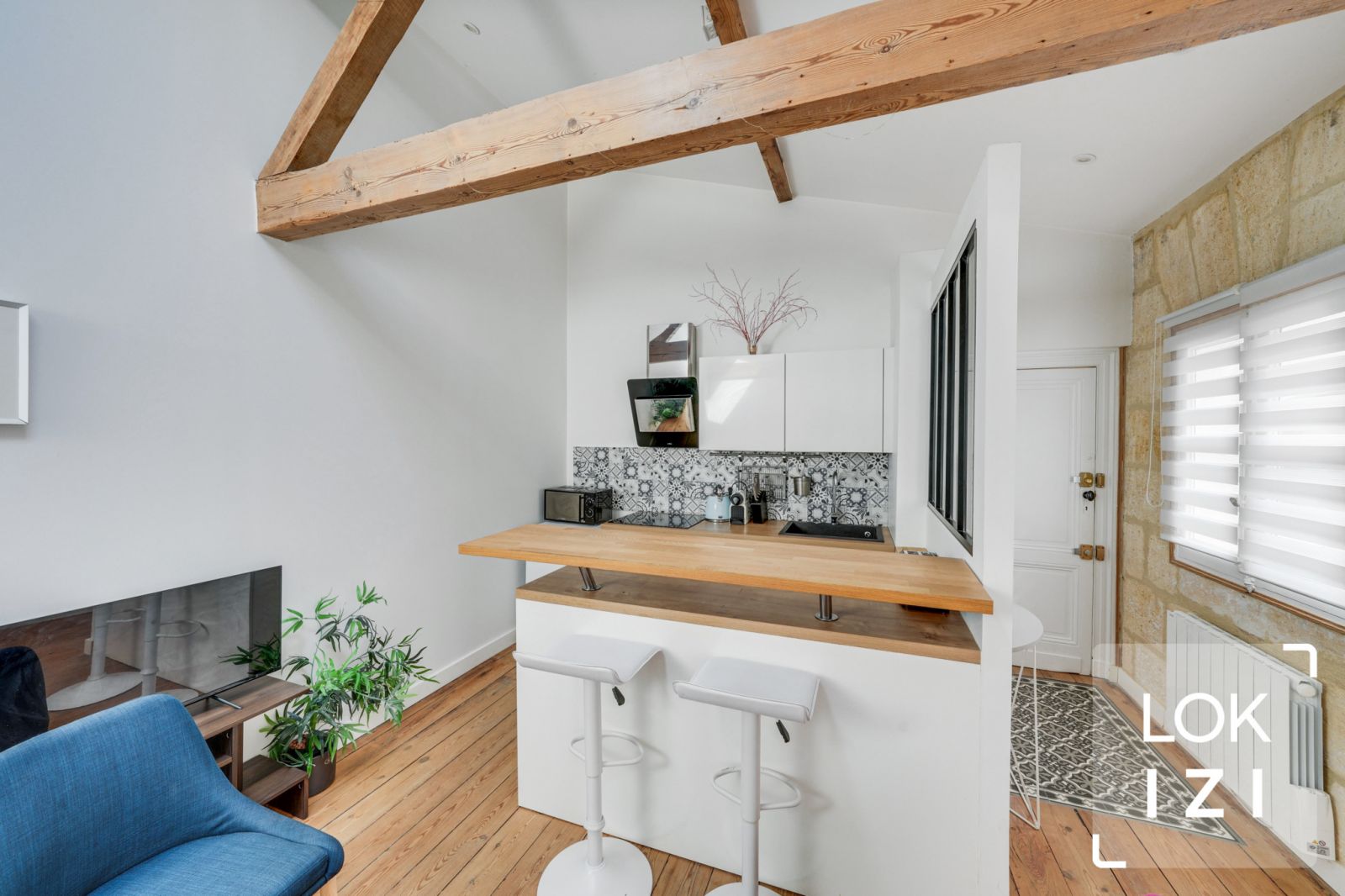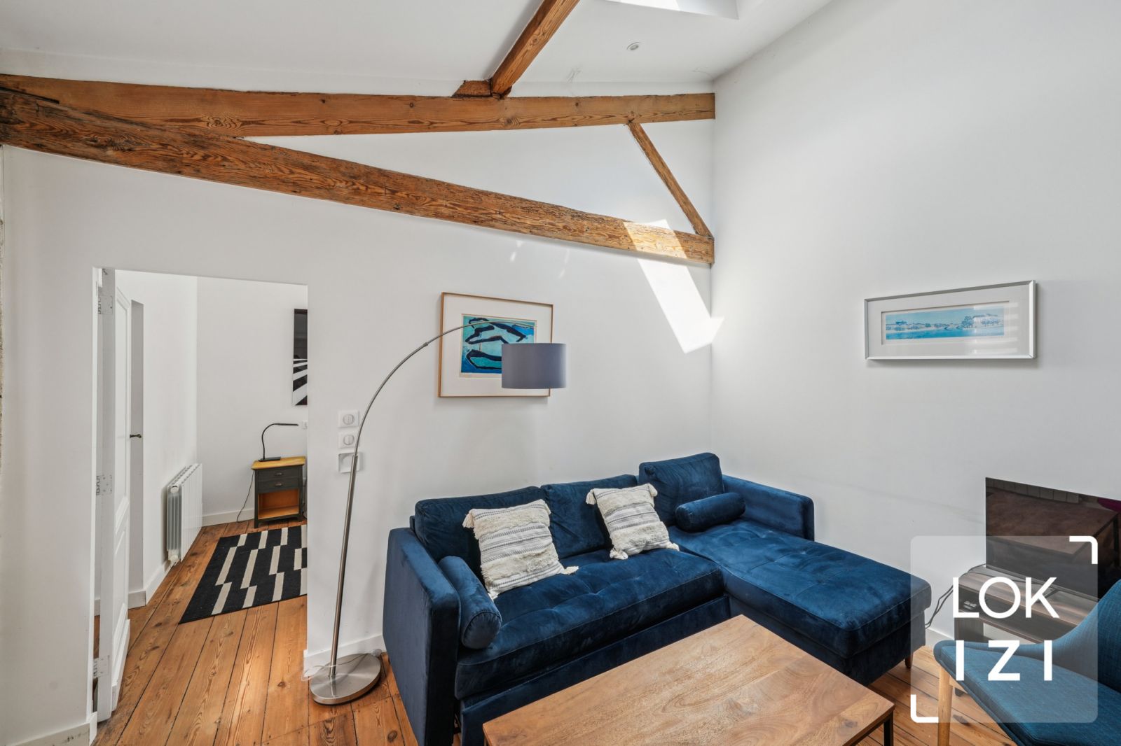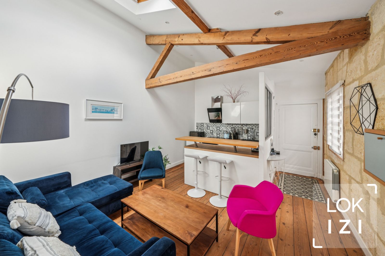 A quelques pas du Jardin Public et des Chartrons, proche des Tram C et D, charmant et lumineux appartement meublé 2 pièces de 35m², situé au 4ème et dernier étage d'un immeuble pierre, et comprenant : - séjour avec espace salon (canapé convertible et TV) - cuisine ouverte (équipée de réfrigérateur, petit électroménager, plaques de cuisson induction, four, micro-ondes, kit vaisselle) - salle d'eau avec douche et lave-linge - chambre avec lit double couchage et armoire.