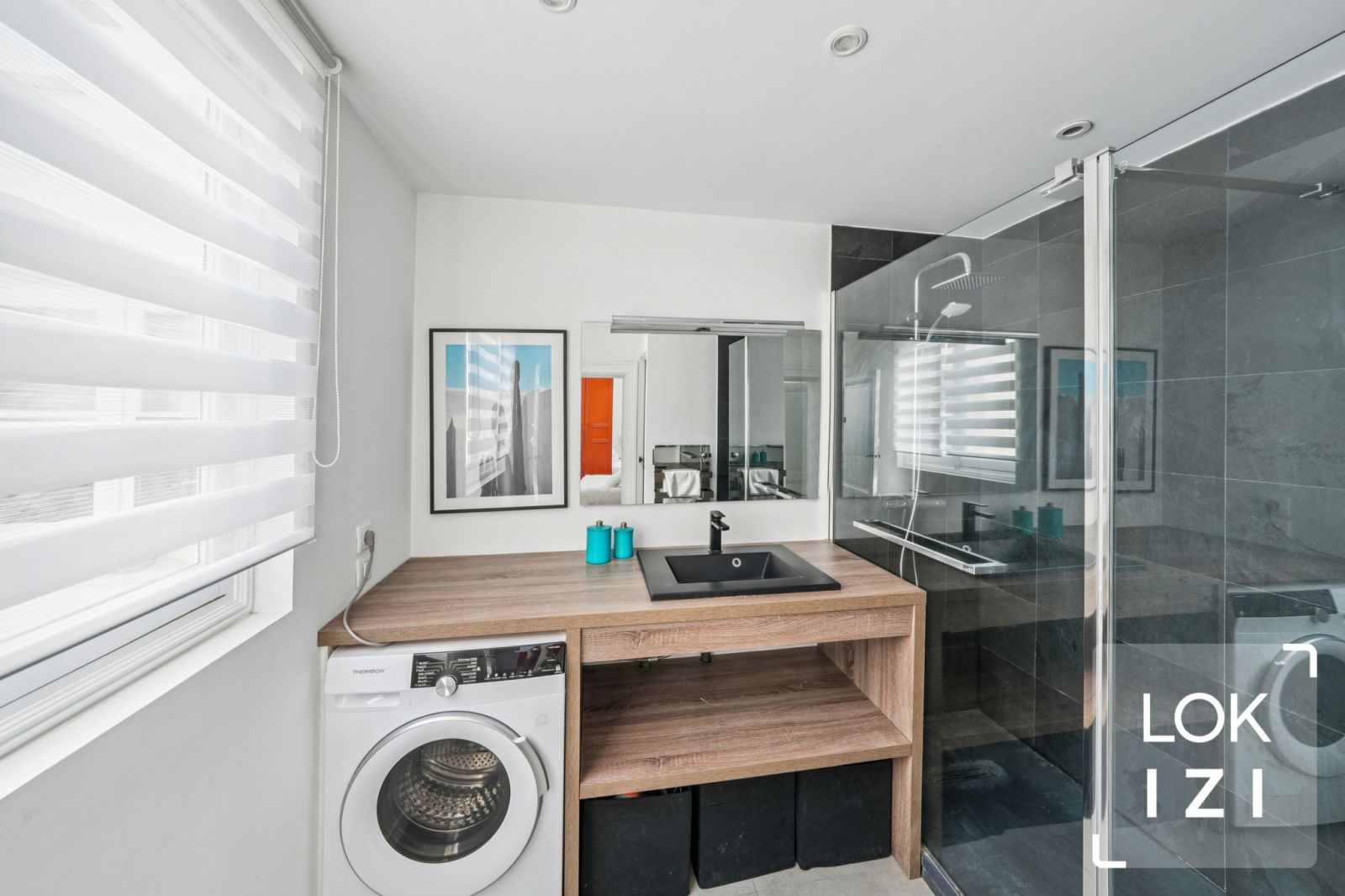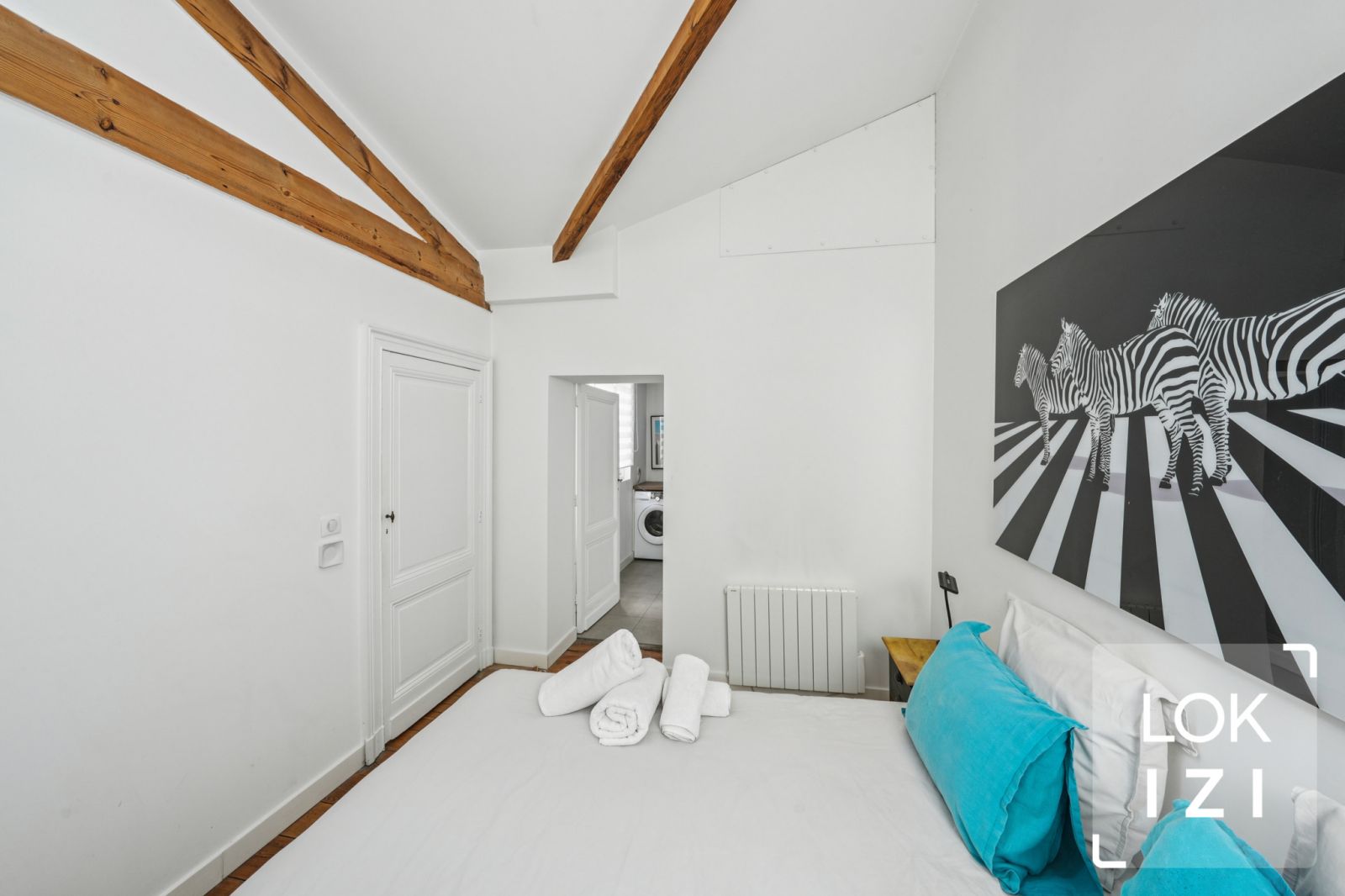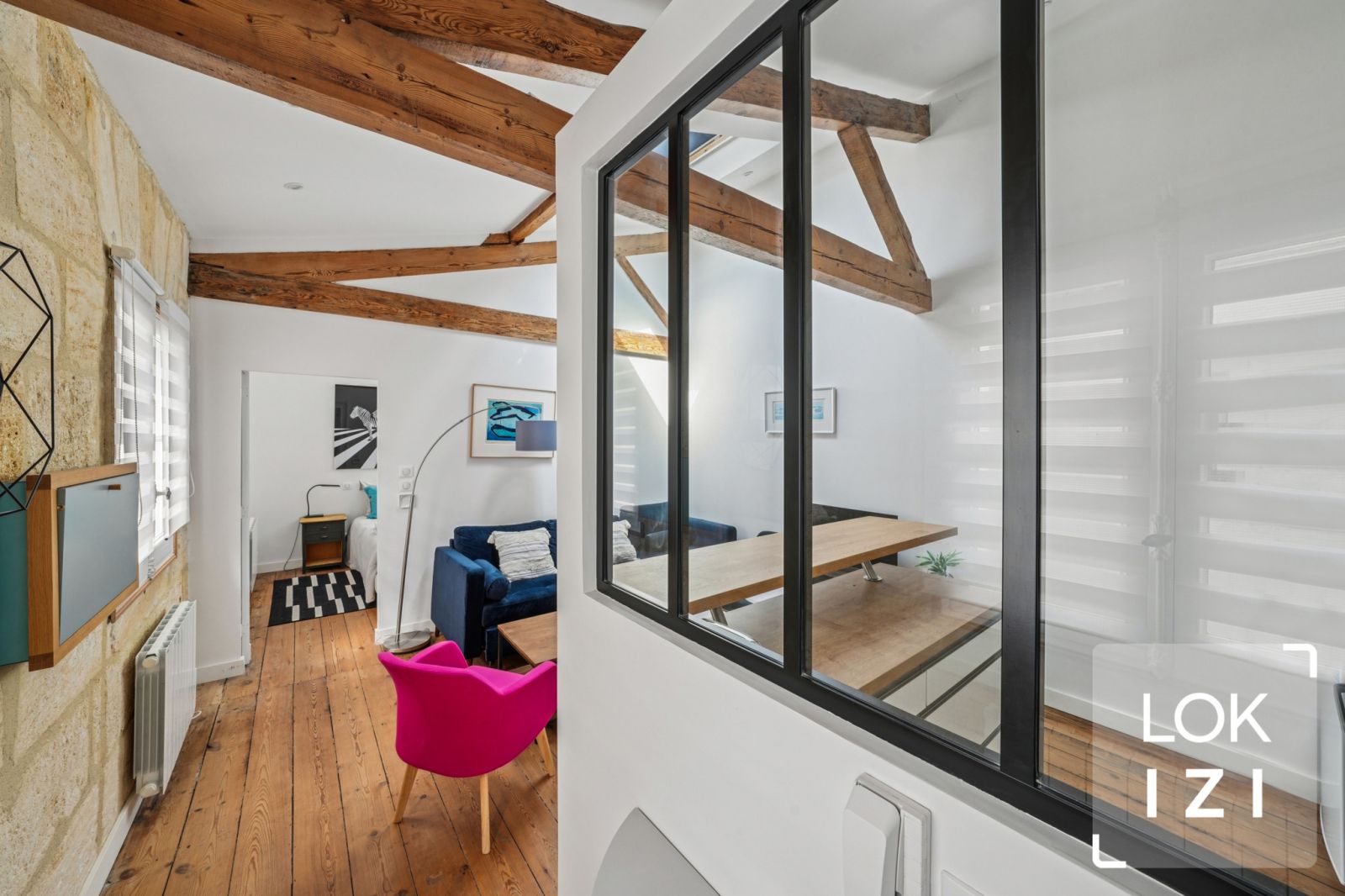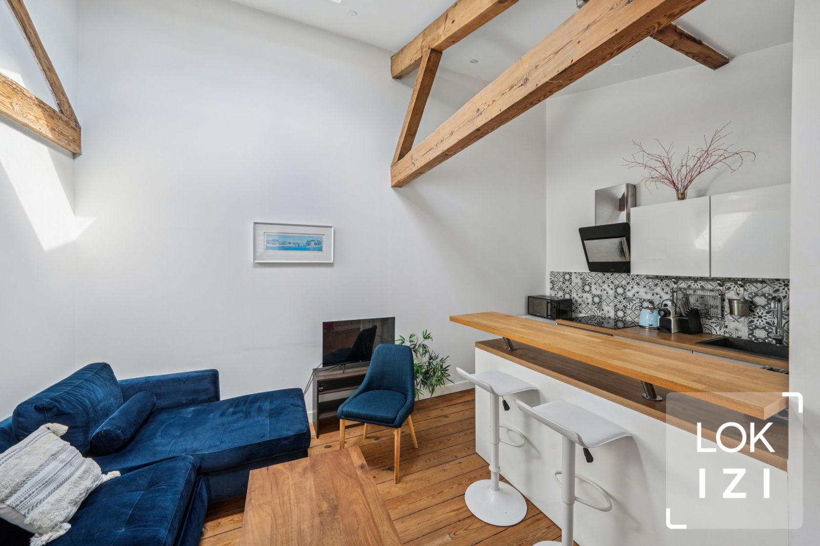 A quelques pas du Jardin Public et des Chartrons, proche des Tram C et D, charmant et lumineux appartement meublé 2 pièces de 35m², situé au 4ème et dernier étage d'un immeuble pierre, et comprenant : - séjour avec espace salon (canapé convertible et TV) - cuisine ouverte (équipée de réfrigérateur, petit électroménager, plaques de cuisson induction, four, micro-ondes, kit vaisselle) - salle d'eau avec douche et lave-linge - chambre avec lit double couchage et armoire.