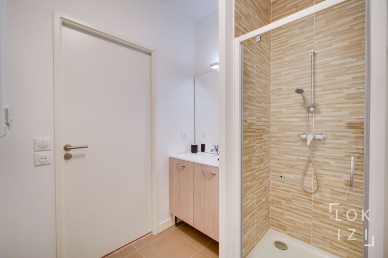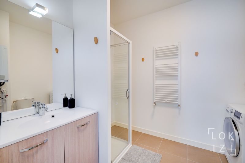 Bordeaux - Bacalan, à quelques pas du tram B. Lumineux appartement meublé T2 de 44m², avec belles prestations, grand balcon-loggia et parking, situé au 2ème étage (avec ascenseur) d'une résidence sécurisée récente de 3 étages, et comprenant : - entrée avec placard-penderie - séjour prolongé d'un balcon-loggia , avec espace repas, bureau et espace salon (avec TV) - cuisine ouverte équipée et aménagée (plaques de cuisson, réfrigérateur, congélateur à tiroirs, four, kit vaisselle et ustensiles) - chambre double couchage avec placard-penderie, lit-coffre de 140x190cm, kit accessoires literie et salle d'eau (douche, WC et lave-linge séchant) - balcon-loggia de 8,5m² (avec mobilier extérieur) - place de parking abritée et sécurisée.