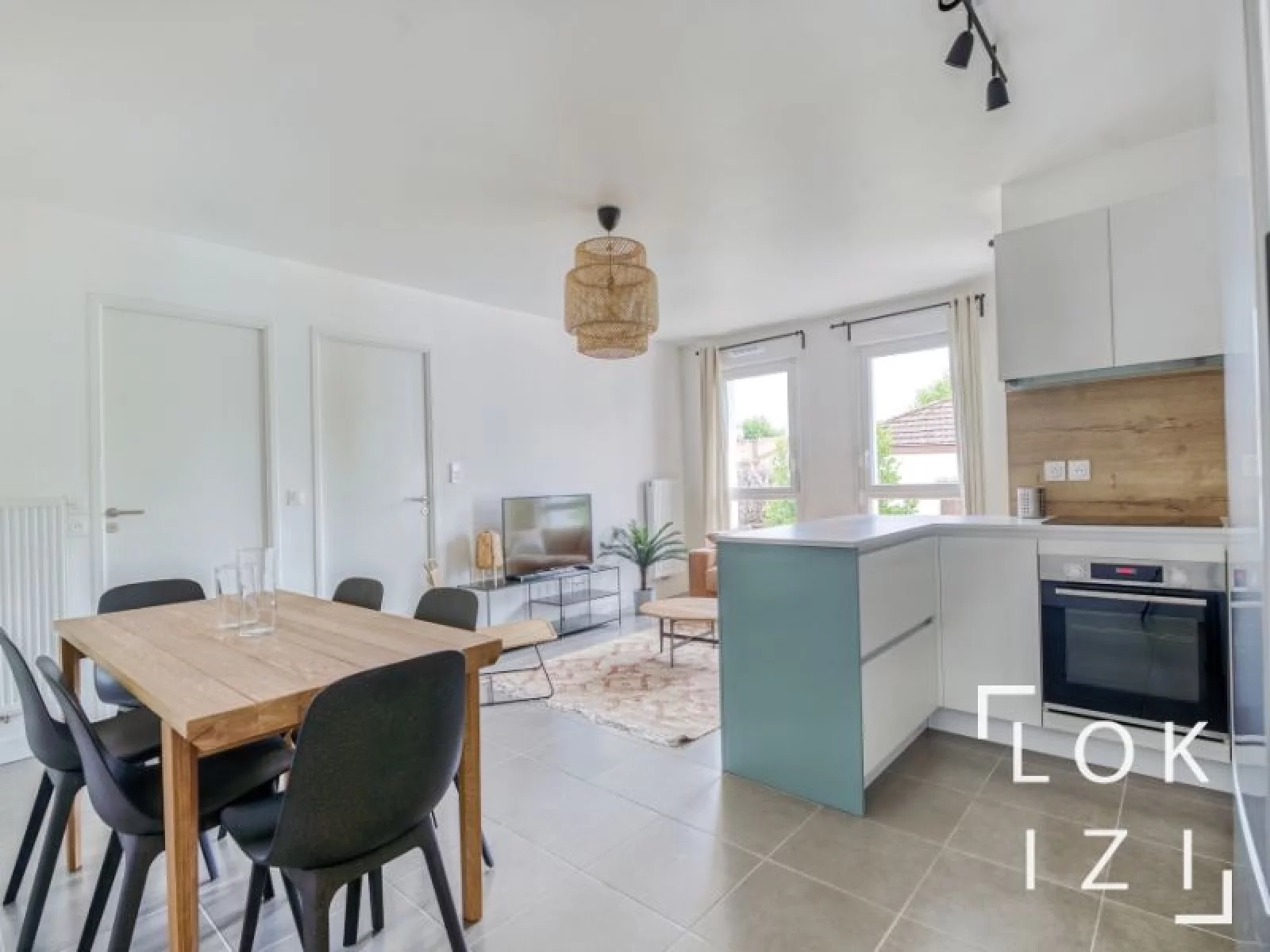Dans une résidence sécurisée neuve, à quelques pas du tram B, lumineux appartement T3 de 64m² entièrement meublé et équipé, avec balcon et parking, situé au 1er étage d'un immeuble de 2 étages, et comprenant : - entrée avec placard-penderie de rangement - séjour donnant le balcon, avec cuisine ouverte équipée et aménagée (lave-vaisselle, lave-linge séchant, plaques de cuisson, réfrigérateur/congélateur, four), espace repas (pour 6 personnes) et espace salon (avec TV) - chambre double couchage (avec placard-penderie) - chambre simple couchage (lit-gigogne transformable en lit double couchage) avec placard-penderie et accès balcon - salle de bains (avec baignoire et placard de rangement) - balcon-loggia (avec mobilier extérieur) - place de parking abritée et sécurisée