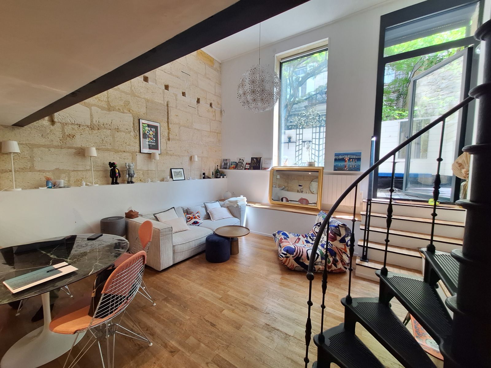 Idéalement situé à quelques pas du Jardin Public et des Chartrons, avec toutes commodités du quotidien sur place (dont Tram C / D) dans le centre de Bordeaux, notre agence LOKIZI - La location meublée vous propose ce charmant et atypique appartement T2bis de 70m² à l'esprit loft, agrémenté d'un garage et d'une terrasse prolongeant l'espace de vie. Entièrement meublé et équipé, ce logement organisé sur 2 niveaux et situé au rez-de chaussée d'un magnifique immeuble pierre se compose ainsi : - entrée - séjour ouvert sur terrasse avec espace salon et espace repas (avec belle hauteur sous plafond) - cuisine ouverte prolongée d'un cellier- buanderie - WC séparés A l'étage (accessible par escalier en colimaçon) dans le séjour : - dégagement ouvert avec espace bureau - 1 chambre double douchage - espace nuit avec 2 lits simple - salle d'eau (douche à l'italienne) - WC - dressing.