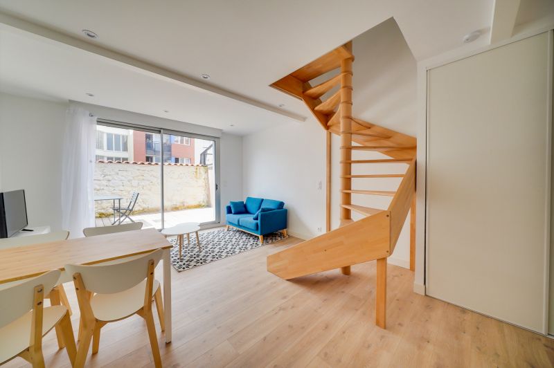 Bordeaux - Ornano, à quelques pas du tram A, appartement T3 duplex meublé de 50m² avec terrasse, situé 1er étage et dernier et comprenant : - séjour-cuisine entièrement équipé (plaques de cuisson à induction, four, réfrigérateur-congélateur, micro-onde et lave-vaisselle) avec espace salon (canapé et TV), table de repas et accès terrasse - terrasse en bois de 12m² avec mobilier extérieur A l'étage : - 2 chambres double couchage (avec armoire ou placard-penderie de rangement) - salle d'eau (douche, WC et lave-linge)