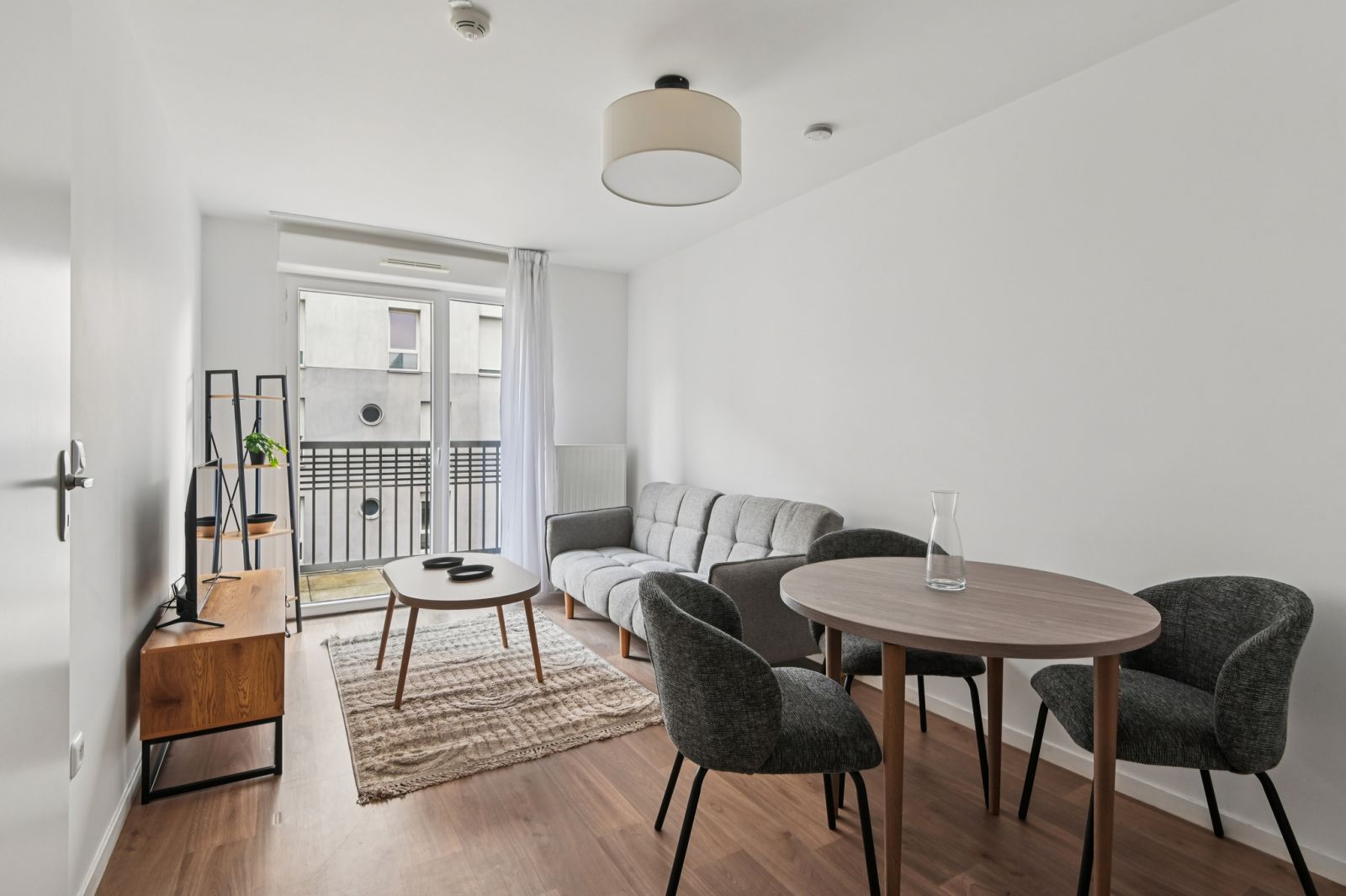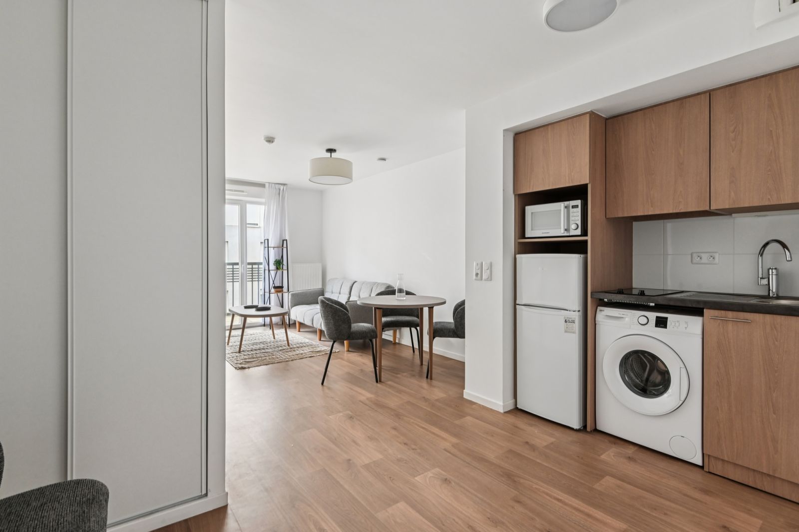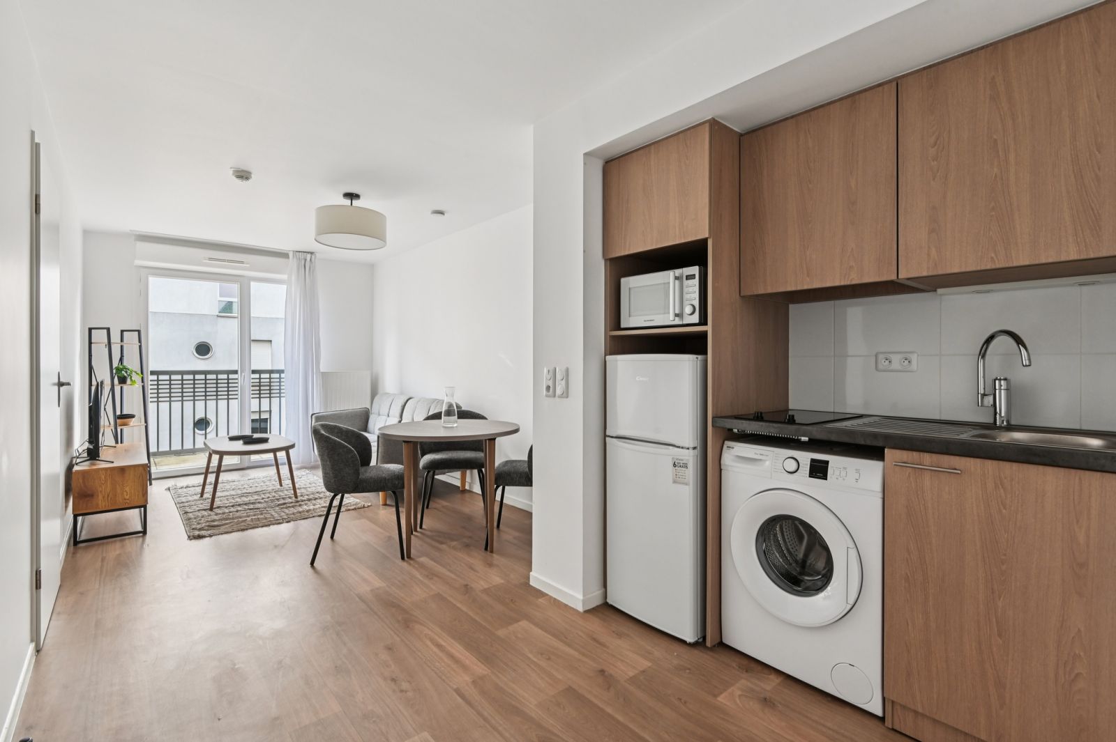 L’appartement (fraîchement rénové) est entièrement meublé et équipé. Il se compose de : - entrée avec placard-penderie - séjour ouvert sur balcon avec espace salon (avec TV) et espace repas - cuisine ouverte avec kitchenette (équipée de réfrigérateur-congélateur, micro-ondes, plaques de cuisson, kit vaisselle, petit électroménager, lave-linge) - chambre avec lit double couchage et mobilier de rangements - salle d'eau attenante à la chambre avec douche PMR et WC.