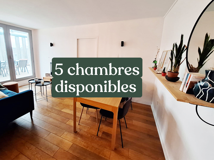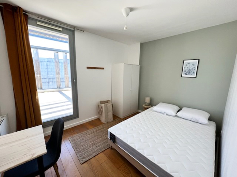 Chartrons, proche Tram B et Cité du Vin. COLIVING. Chambre meublée TOUTES CHARGES COMPRISES de 19m² dans spacieux appartement T6 de 116m² (soit 5 chambres) à l'esprit colocation, avec grande terrasse, situé au 6ème et dernier étage d'un immeuble récent (avec ascenseur), et comprenant : Partie privative (9,1m²) : chambre avec lit double couchage, bureau, dressing. Parties communes : salon-séjour (avec TV) prolongé d'une grande terrasse de 64m², avec espace repas-cuisine ouverte (équipée de réfrigérateur'congélateur, plaques de cuisson, four, lave-vaisselle, lave-linge, petit électroménager, kit vaisselle), 1 salle de bains (baignoire et double-vasque), 1 salle d'eau (douche + WC), 1 WC séparés.