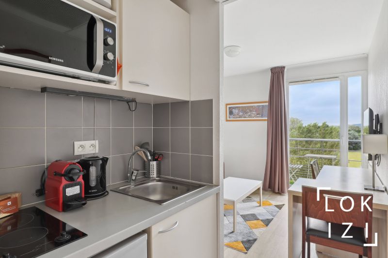Avignon gare TGV, à 5mn des écoles et instituts et 15mn de l'aéroport Avignon-Provence, lumineux studio de 20m² entièrement meublé, avec balcon, situé au 5ème et dernier étage (avec ascenseur) d'une résidence sécurisée, proposé exclusivement en location meublée longue durée, et comprenant : - entrée avec kitchenette équipée (plaques de cuisson, vaisselle, micro-onde, petit électroménager) - pièce à vivre avec canapé convertible, bureau et placard-penderie - salle d'eau (avec douche et WC) - balcon avec vue dégagée et mobilier extérieur.