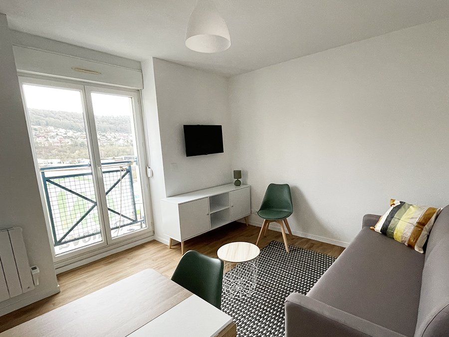 ROUEN rive droite – DARNETAL, proche Ecole Nationale d’Architecture, bus, métro et commerces, location EN EXCLUSIVITE de studio 20,2m² entièrement meublé avec parking, situé au 2ème er dernier étage d'une résidence sécurisée, et composé d'une pièce de vie avec kitchenette équipée, coin salon (avec canapé convertible et TV murale), coin repas / bureau, mobiliers de rangement et d'une salle d'eau (avec douche, WC et lave-linge).