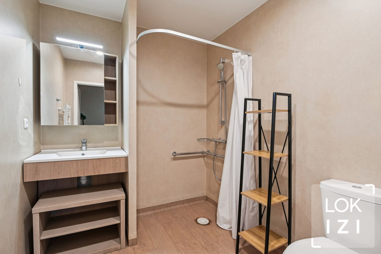 Le studio (fraîchement rénové) est entièrement meublé et équipé. Il se compose de : - entrée avec kitchenette équipée (avec réfrigérateur, micro-ondes, plaques de cuisson, kit vaisselle, petit électroménager) et placard-penderie (avec lave-linge) - pièce à vivre ouverte sur balcon avec espace salon (avec canapé convertible rapido + TV) et espace repas - salle d'eau avec douche PMR et WC.